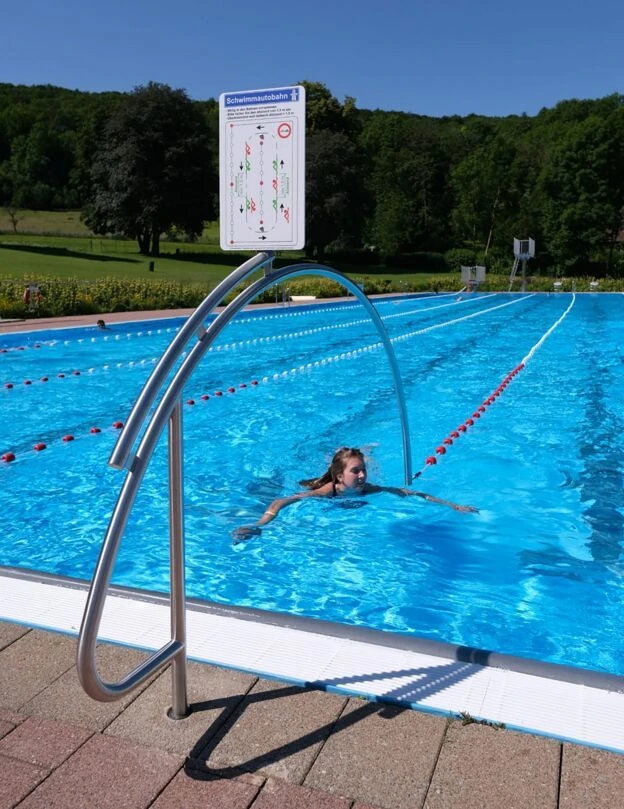 Der Bügel für die sogenannte Schwimmautobahn macht aus 2 Bahnen eine Art Kreisverkehr und Schwimmer können ideal Ihre Runden schwimmen. Der Bügel ist aus V4A Edelstahl inklusive einer Bodenhülse und einer Hinweistafel zu den Regeln. Für die Befestigung muss die Bahnenleine insgesamt 4 m gekürzt werden (2 m an jeder Seite) bei der Installation von 2 Durchschwimmbögen.