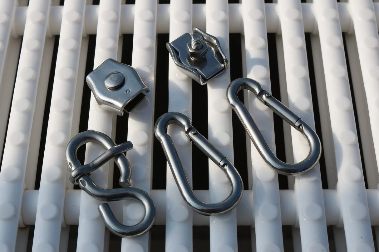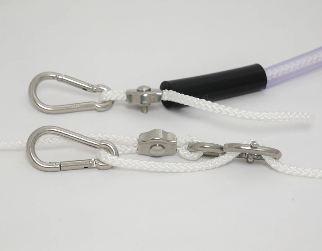 Endbeschlag-Set aus V4A-Edelstahl für Trainingsleinen, bestehend aus 2 Karabinerhaken, 2 Simplexklemmen, 1 Stellacht.