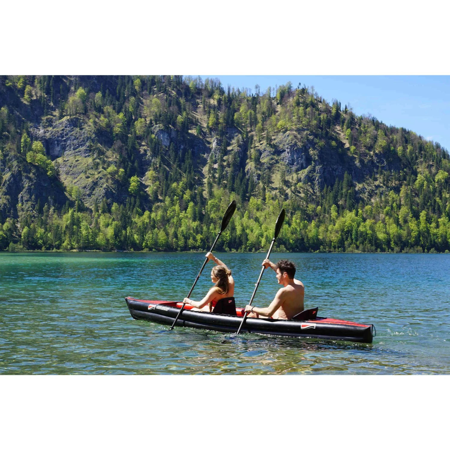 Platz für kleineres Gepäck findet sich im Bug und Heck. Für einen einfachen Transport sind zwei Tragegriffe vorhanden. Zudem zählen D-Ring-Beschläge, Ventiladapter Bajonett, Ventilschlüssel sowie ein Reparaturset zur Ausstattung.