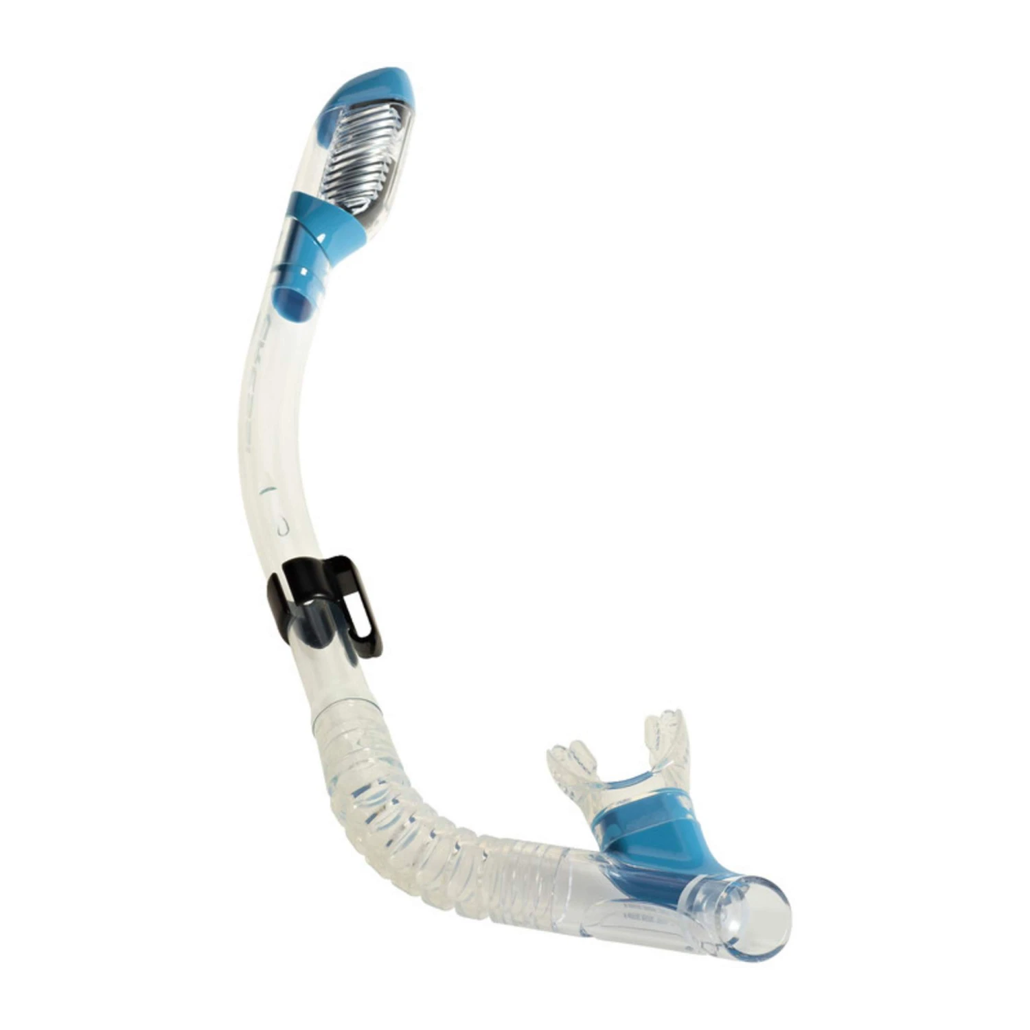 Kompakter Silikon-Schnorchel für Kinder, Jugendliche oder auch zierliche Frauen. Am Ausgang des Rohrs befindet sich ein Spritzwasserschutz. Mit verstellbarem Befestigungs-Clip.