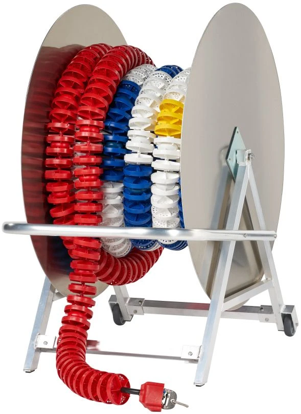 Stabiler Schwimmleinenwagen aus Aluminium mit zwei Rollen. Lieferung inkl. Haspel-Arretierung – so rollen sich die Schwimmleinen nicht mehr selbständig ab. Qualität made in Germany.