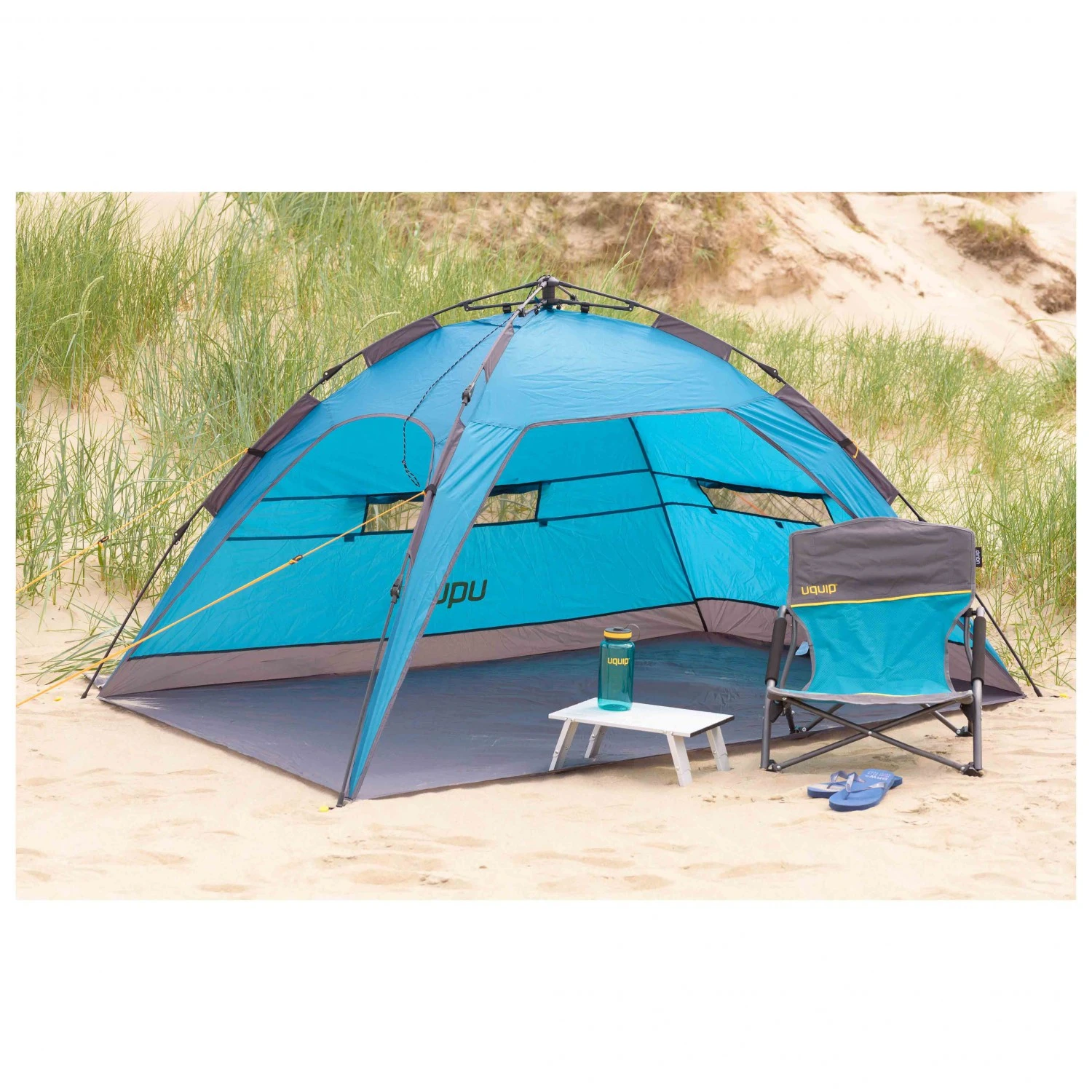Lange Aufbauzeiten gehören der Vergangenheit an: Dank seines einfachen Aufbaumechanismus ist das Strandzelt Buzzy von Uquip schnell einsatzbereit. Dabei spart es aber nicht an anderen wichtigen Eigenschaften. So bietet das Zelt einen guten UV-Schutz und ist dank des verwendeten Polyesters stabil und leicht. Um vor Sand und Nässe im Innenraum zu schützen, ist Buzzy mit einer Bodenplane ausgestattet, sowie zwei verschließbaren Fenstern. Dabei wird mit den Maßen von 215 x 150 x 1150 cm ausreichend Platz geboten. Ein idealer Begleiter für den nächsten Strandbesuch.